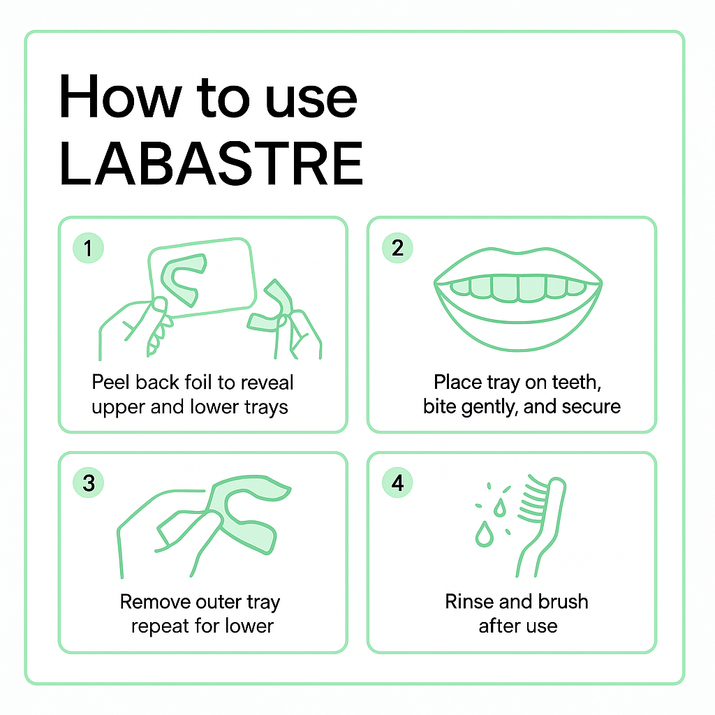 Answer 1: Simply load the provided whitening gel into each tray, insert them over your teeth, and wear for the recommended time stated in the instructions. Enjoy the comfort of the soft silicone while the mint essence keeps your mouth feeling fresh.