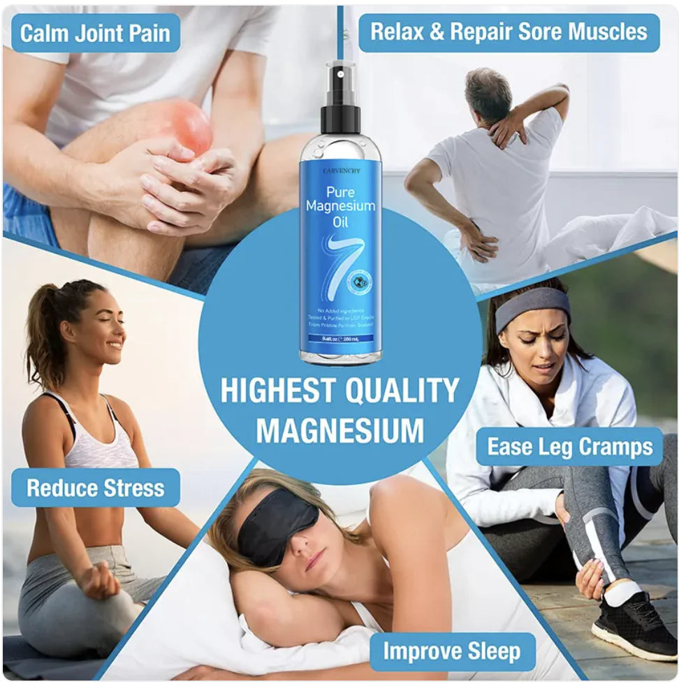 Answer 1: This magnesium oil spray helps alleviate fatigue, relax muscles, and nourish the skin. It promotes relaxation and overall well-being while providing relief from tension and cramps.